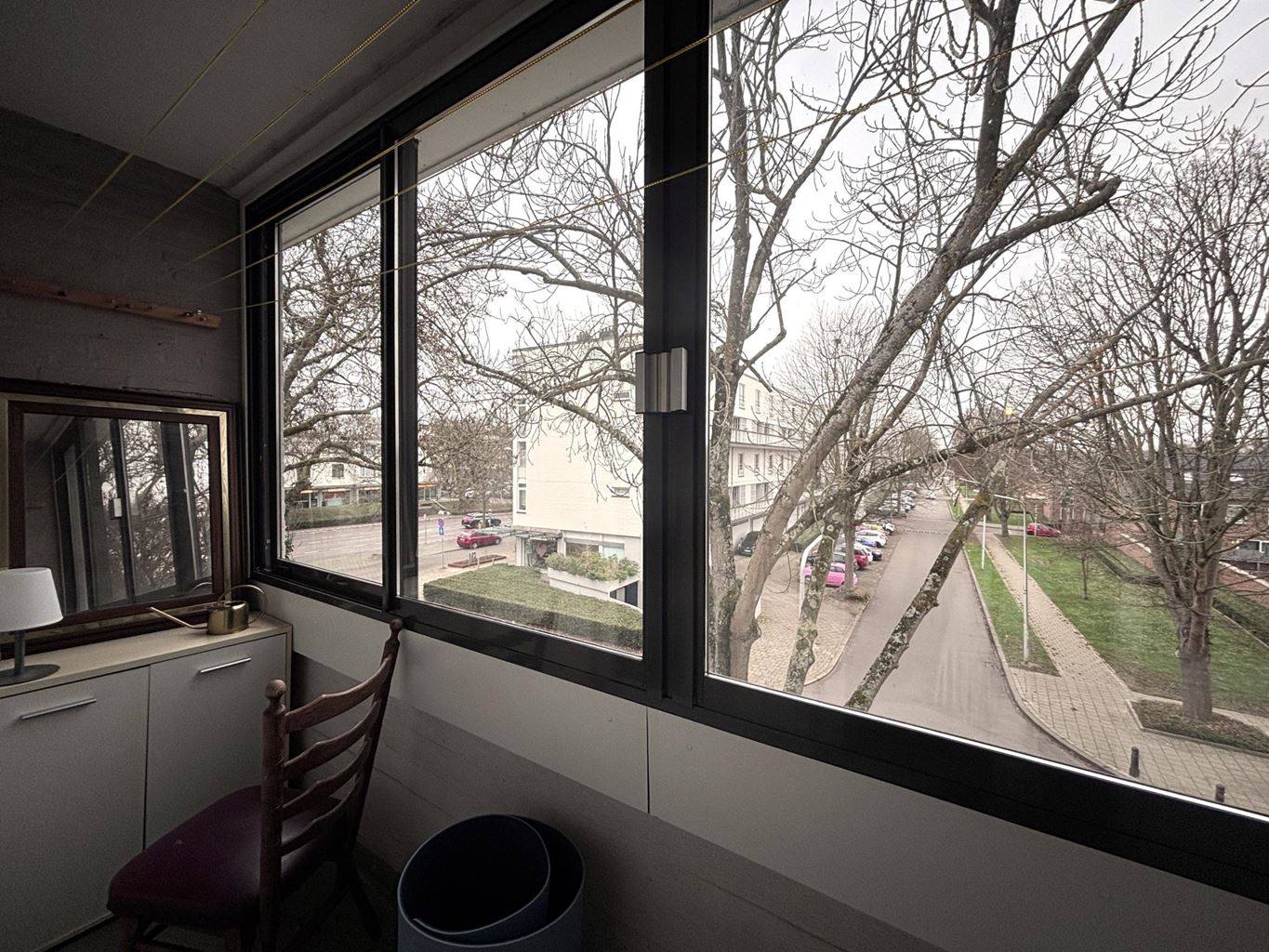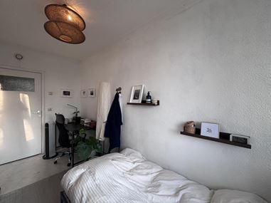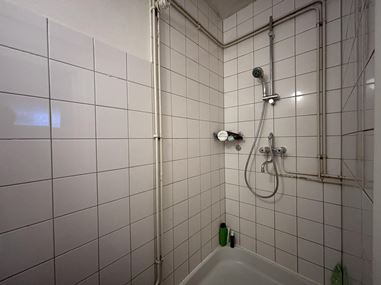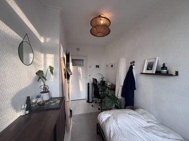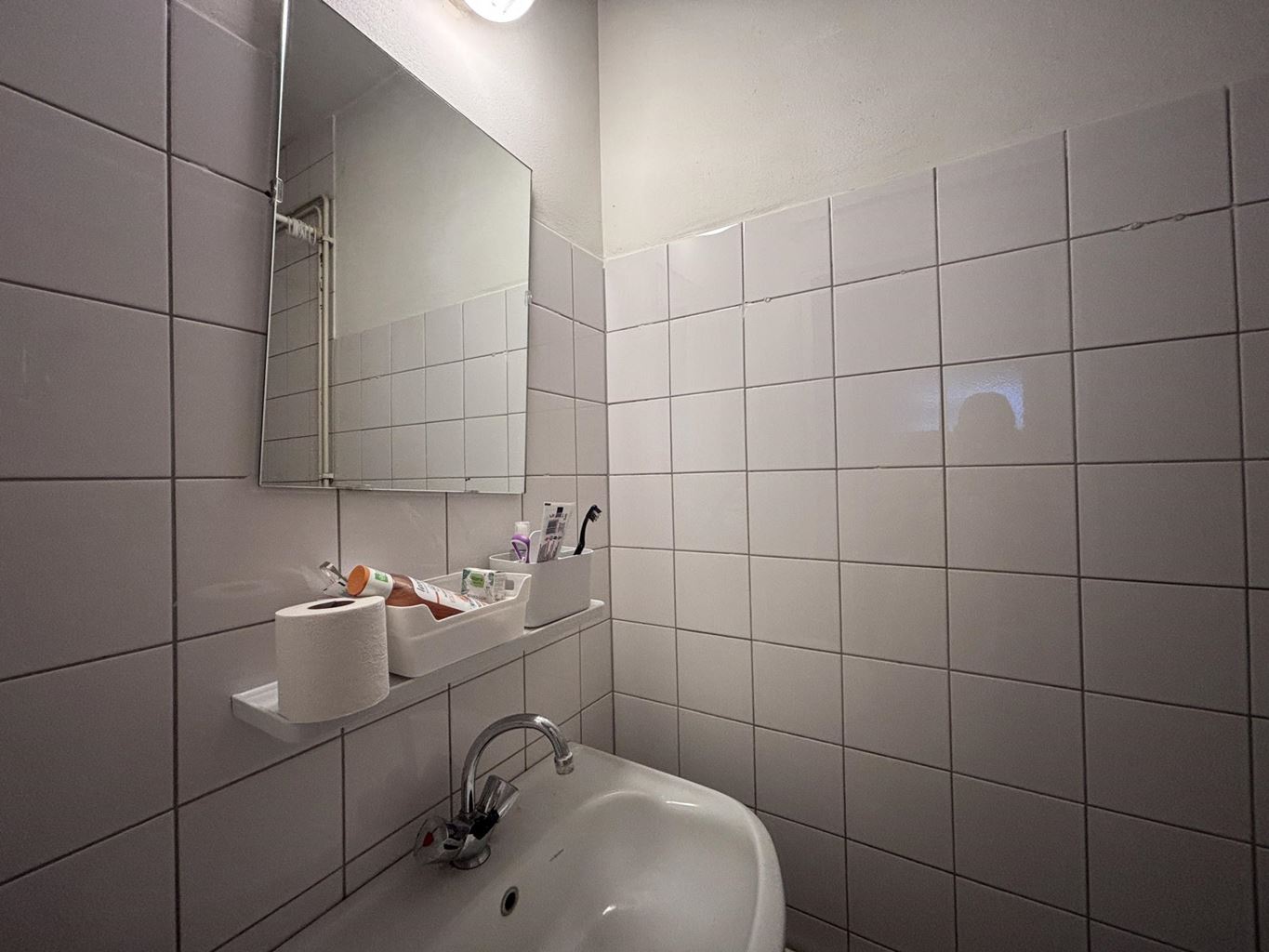 Via het trappenhuis kom je op de eerste verdieping van het appartement. Hier bevinden zich drie van vier kamer, waaronder de beschikbare kamer. Via de beschikbare kamer is er toegang tot het balkon, dat gedeeld wordt met één andere huisgenoot. Via de hal is er toegang tot de badkamer. De badkamer is voorzien van een wastafel en een douche.