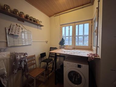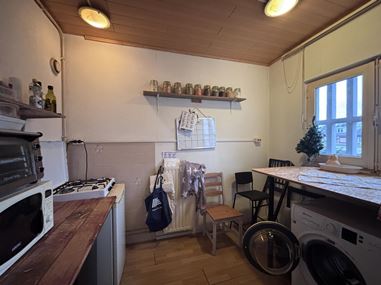 Bij binnenkomst via de gezamenlijke entree kom je in de hal, waar zich een apart toilet bevindt. Vanuit de hal is tevens toegang tot de gezamenlijke keuken, die is uitgerust met een 4-pitsgasfornuis, een koelkast, een vriezer, een magnetron en een oven. Tevens staat de gedeelde wasmachine in de keuken. Eén van de vier kamers liggen op de begane grond.